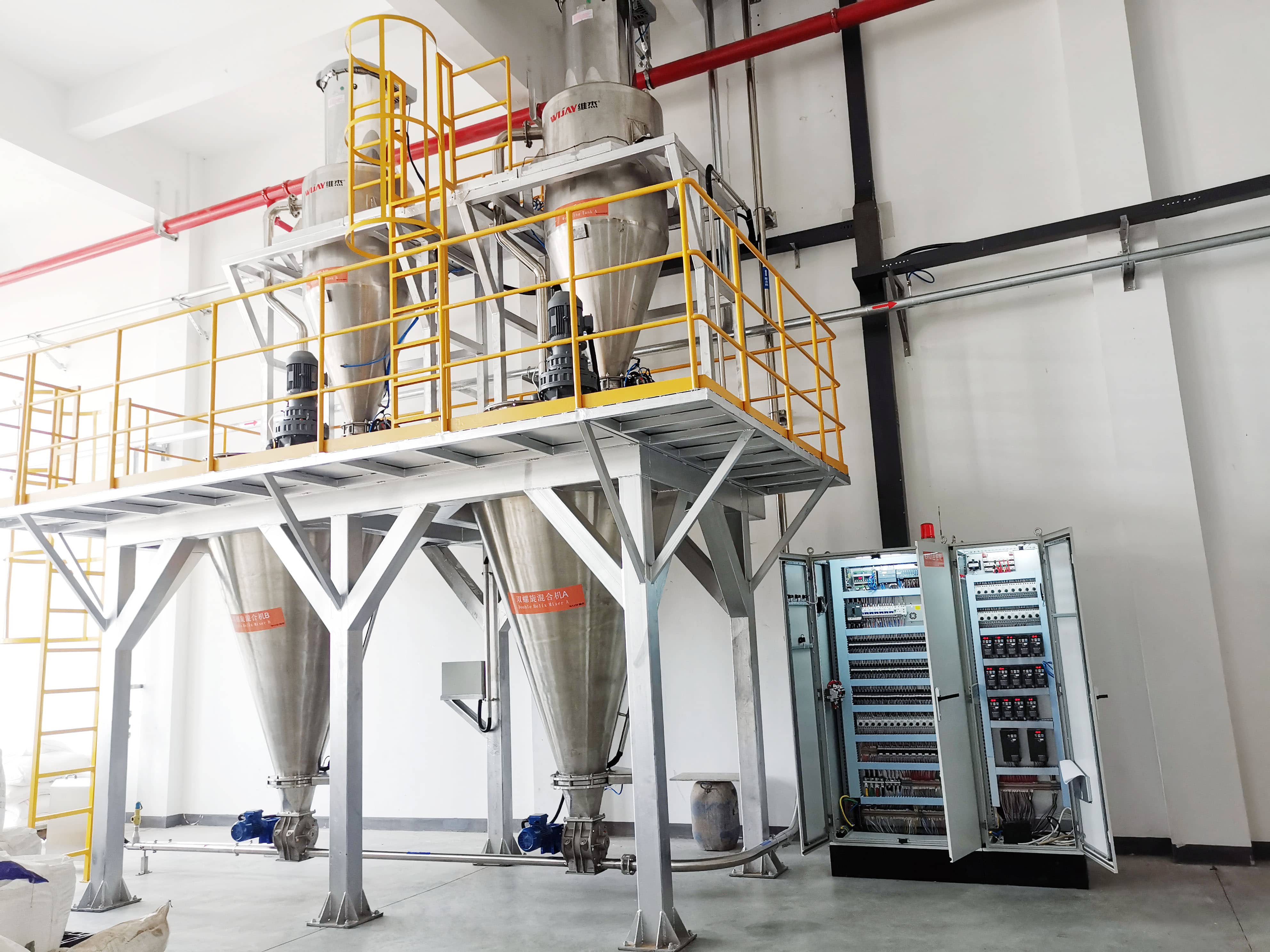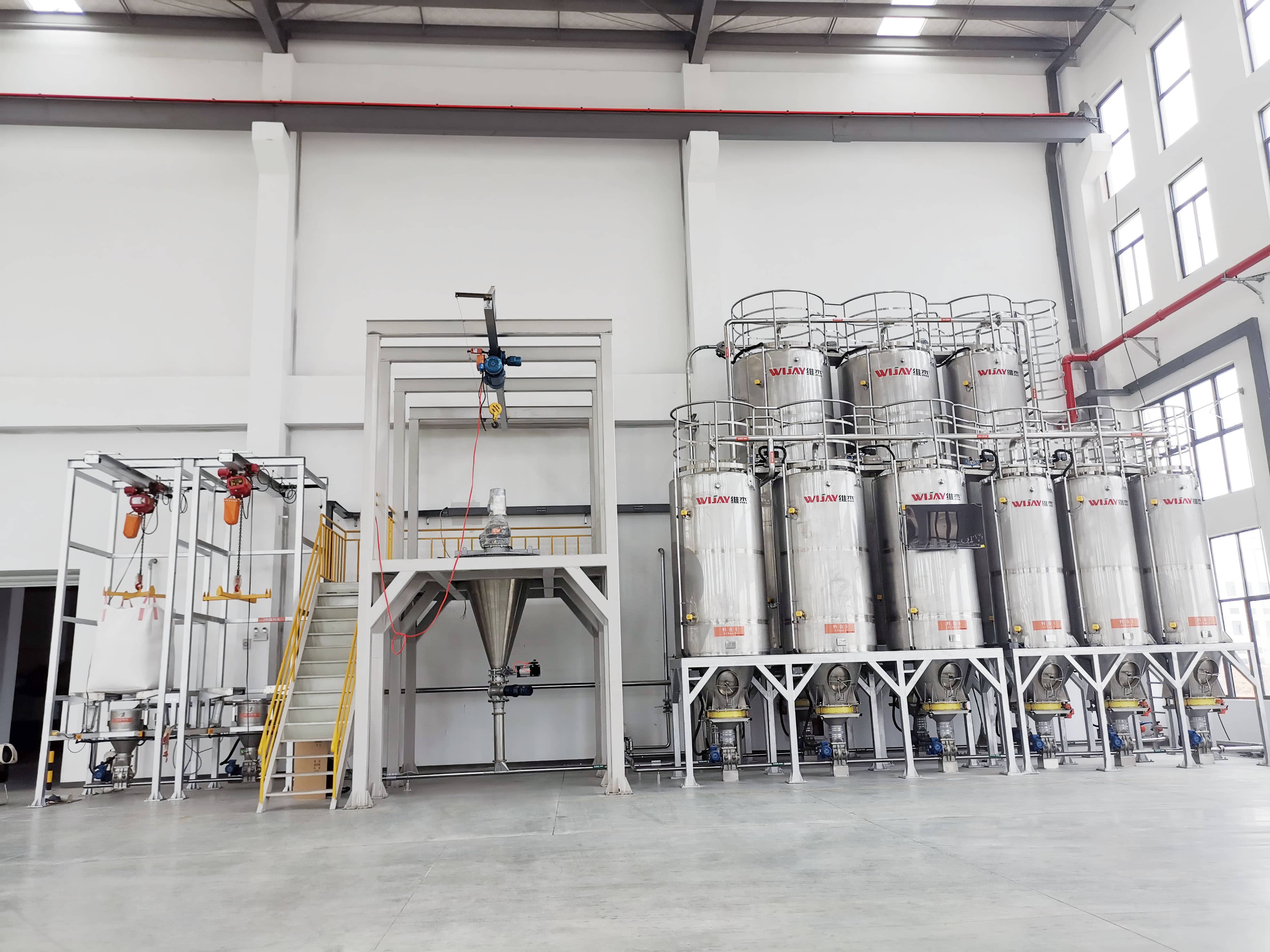 光学材料生产需非常精准的配方和高洁净度,因此维杰为其按食品级的标准设计了全自动化配料及混料系统。配方的原料多达十多种粉料和粒料,原料的特性也具有多样性,特别是堆密度范围更是从0.3公斤每升到3.8公斤每升。物料除了吸潮特性外还具有粘秥性,对物料输送和混合系统是个严峻的考验。维杰工程师采用了维杰专利ACU及双管输送技术结合的方式,完全克服了堵管的技术难题。在混合系统中维杰的专门设计的双旋转混合机具有混合效率高出料快的特点,使得两台混合设备即可轻松实现120吨每天的高均匀度混合物料供应。