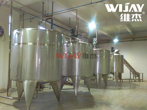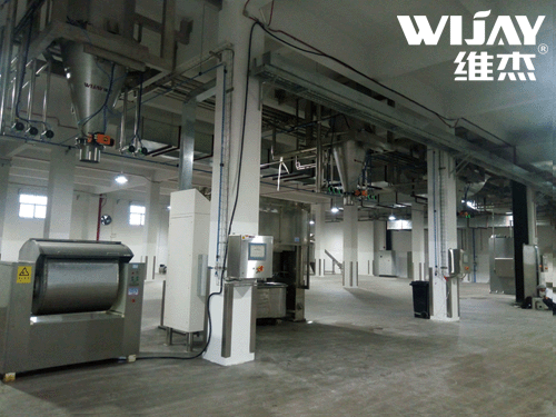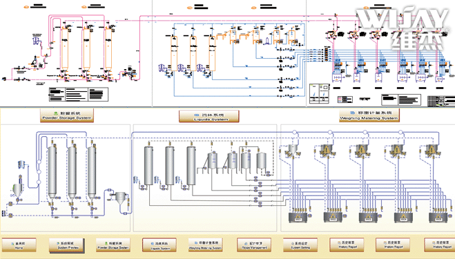 本系统包括了粉体原料处理模块和流体原料处理模块、以及CIP清洁系统、冷热水物料恒温模块、3种粉体、6种流体的输送与计量。