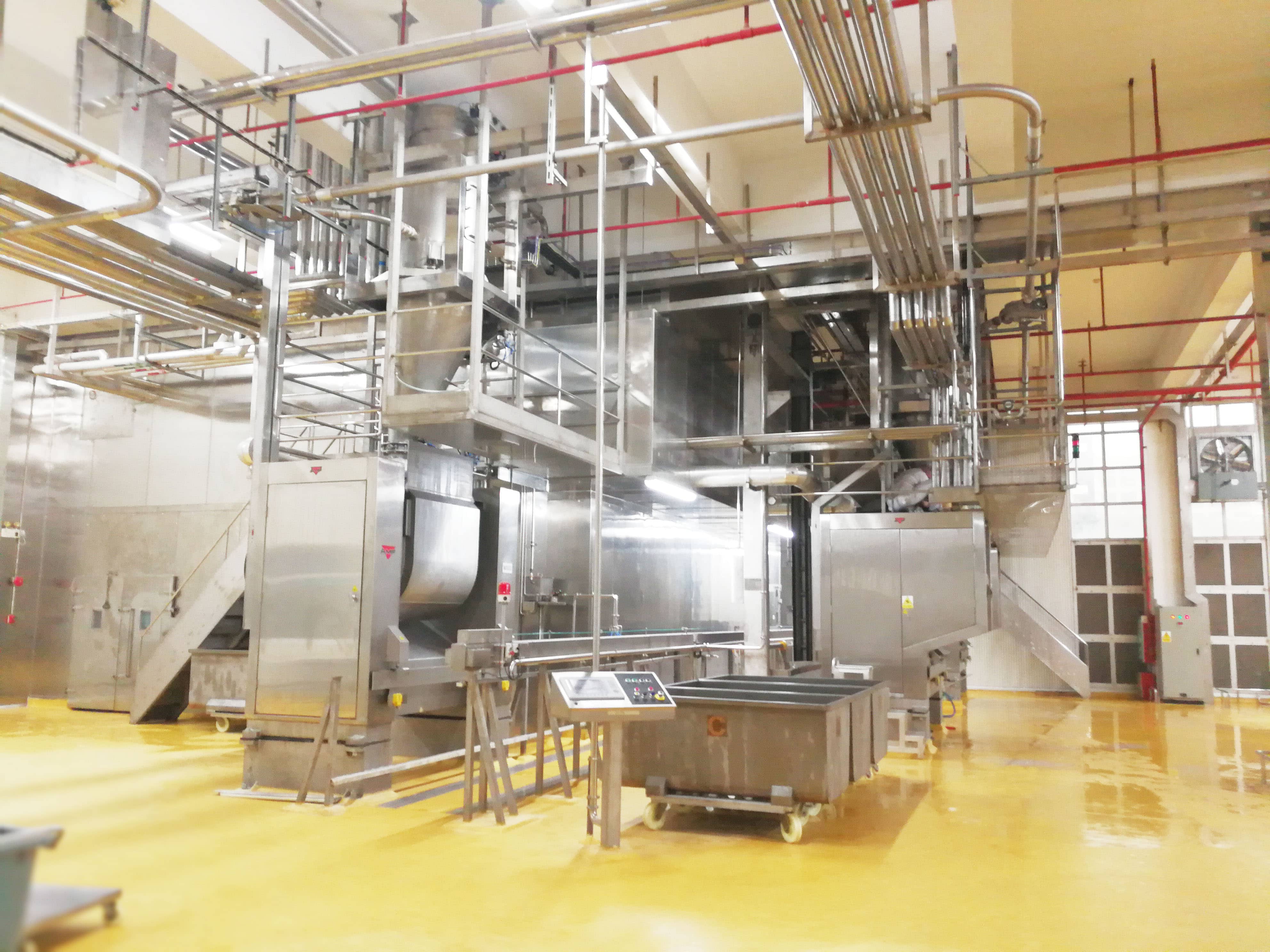 客户工程目前拥有国际先进的2两条面包及4条的蛋糕生产线,生产能力高达300T每天。该生产基地需要使用到的主要原材料有3种面粉及7种流体原料,其中包括极为敏感的酵母溶液和新鲜的蛋液。这次维杰负责的物料自动化处理系统需要承担10种原料处接收、储存、筛分、过滤、输送、计量的全部事项,系统还可以对相关的物料进行温度控制,并对各条生产的使用量及总体用量进行统计分析。